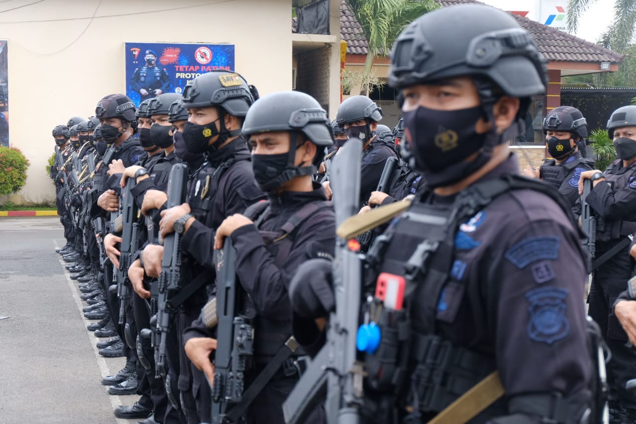 Kapolda Sulsel Irjen Pol. Nana Sudjana AS., M.M., memimpin apel kesiap siagaan personil Sat Brimob Polda Sulsel di Makosat Brimob Polda Sulsel Jl KS. Tubun Kec Mariso Kota Makassar, Rabu (29/12/2021).