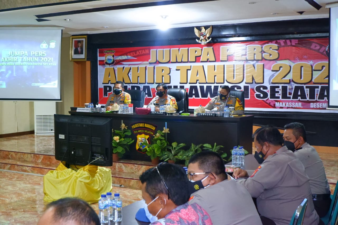Kepala Kepolisian Daerah Sulsel Irjen. Pol. Drs. Nana Sudjana AS., M.M., memimpin langsung kegiatan release akhir tahun 2021 yang diselenggarakan di Aula Polrestabes Makassar, Jumat (32/12/2021).