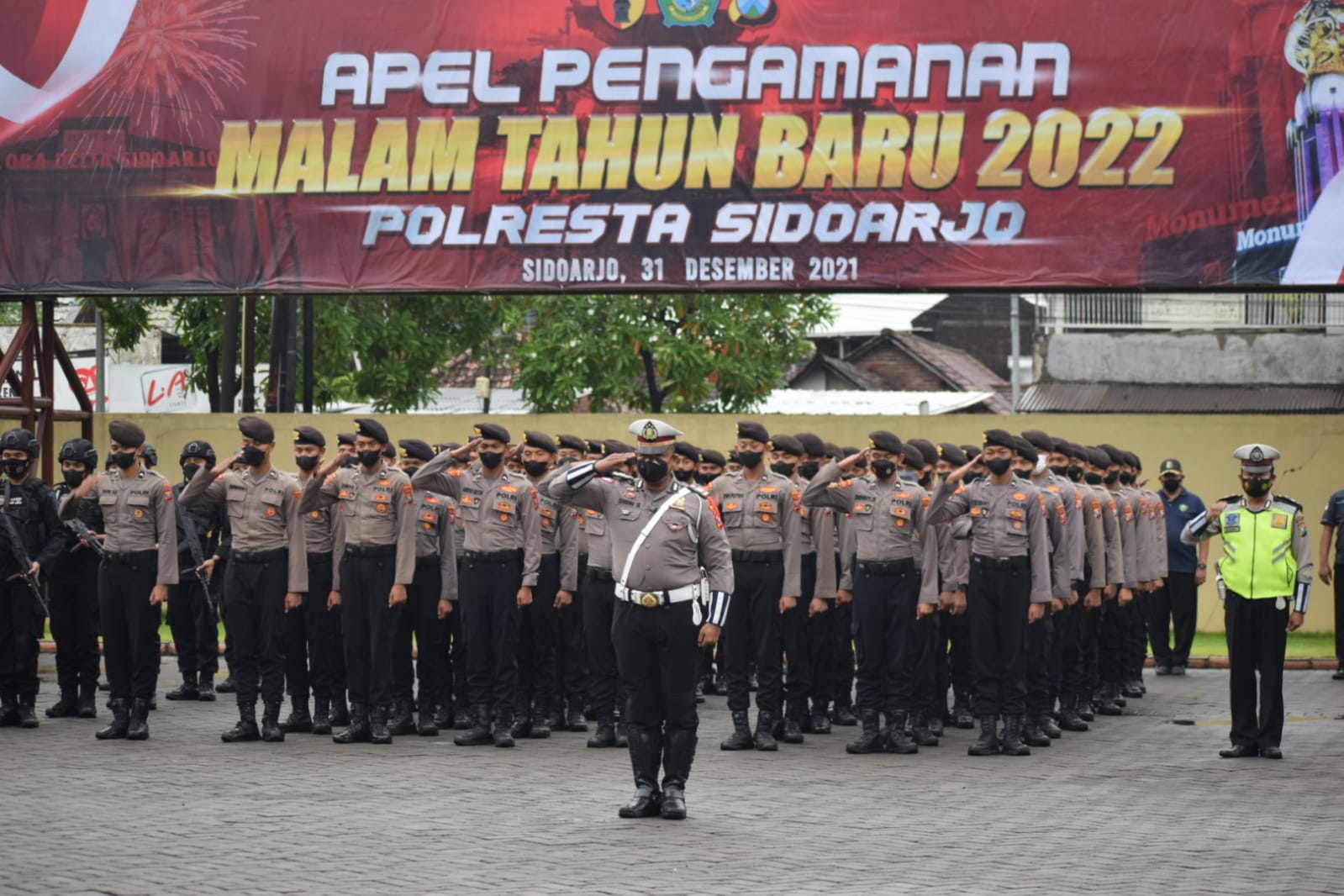 Kapolresta Sidoarjo Kombes Pol. Kusumo Wahyu Bintoro, pada Apel Pengamanan Malam Tahun Baru 2022 di Mapolresta Sidoarjo, Jumat (31/12/2021), menyampaikan agar para personel yang bertugas melakukan tugas sebaik mungkin di penghujung tahun ini.