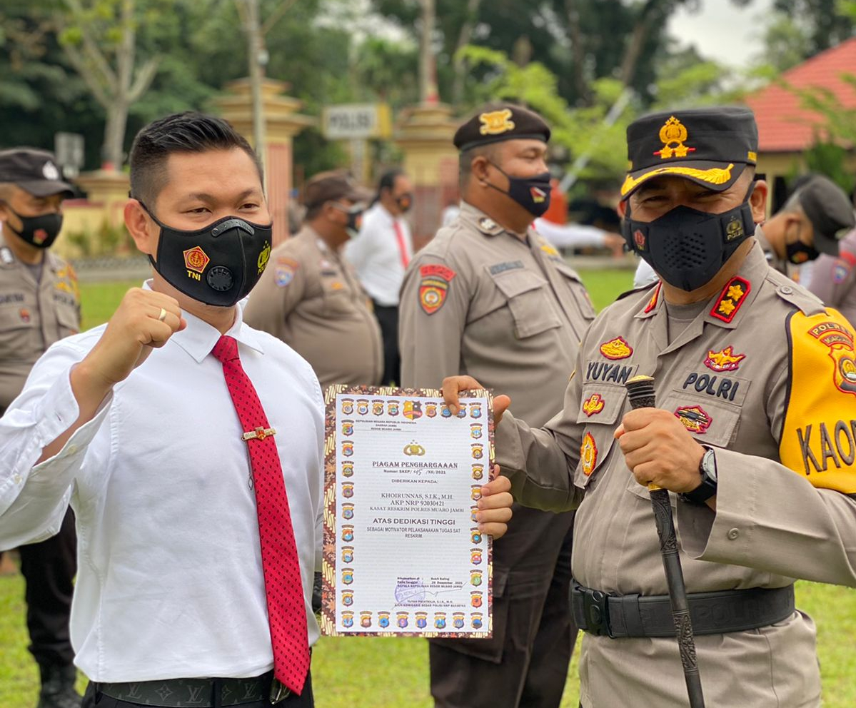 Kasat Reskrim Polres Muaro Jambi AKP Khoirunnas SIK MH kembali menerima piagam penghargaan atas dedikasi peringkat pertama penyelesaian perkara tindak pidana semester II TA 2021 SE Polda Jambi dan jajaran , dan juga diwaktu yang sama juga menerima penghargaan sebagai motivator pelaksanaan tugas Sat Reskrim , penghargaan yang diterima beliau pada awal tahun tertanggal 1 Januari 2022 di Mapolres Muaro Jambi yang diserahkan langsung oleh Kapolres Muaro Jambi AKBP Yuyan Priatmaja SIK MH