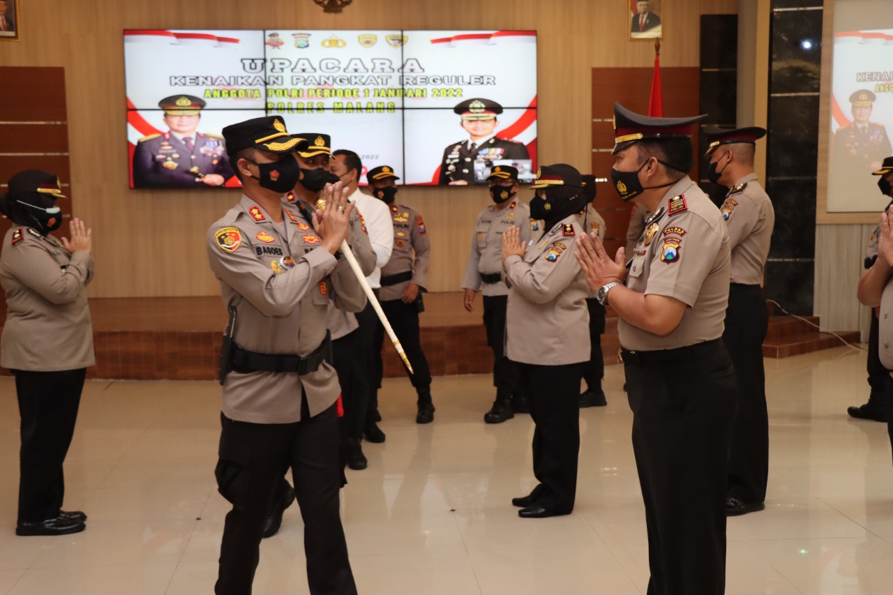 Ratusan anggota Polres Malang menerima kenaikan pangkat setingkat lebih tinggi periode Januari 2022. Upacara korp raport tersebut digelar di Gedung Sanika Satyawada Polres Malang, Senin (3/1/2022).