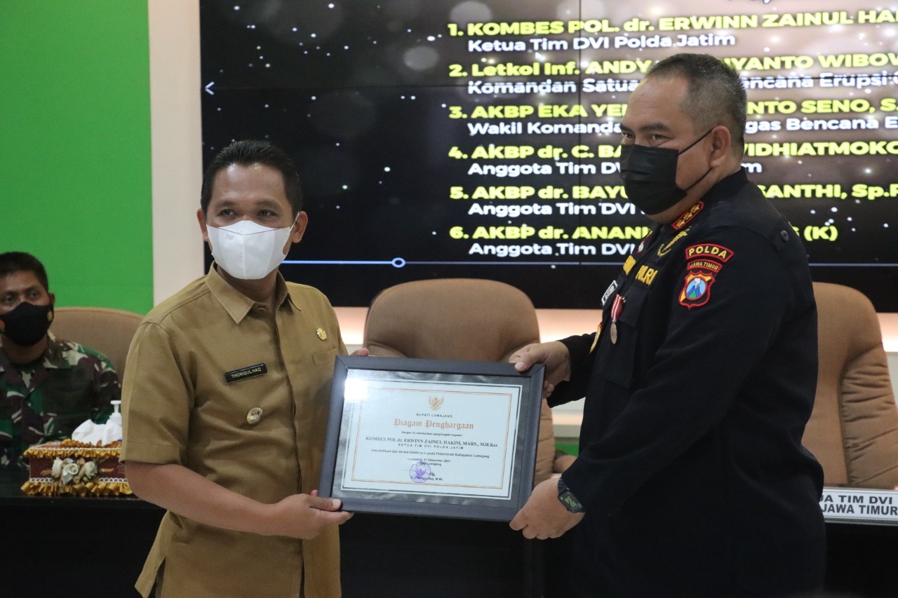 Bupati Lumajang Berikan Penghargaan Kepada Biddokkes Polda Jatim Sebagai DVI Commander Ops DVI Bencana APG Gunung Semeru