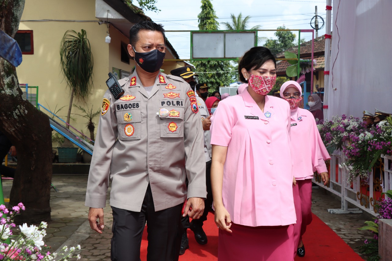 Kapolres Malang AKBP Bagoes Wibisono bersama ketua pengurus Yayasan Kemala Bhayangkari Cabang Malang Ny. Eka Bagoes Wibisono gelar Gebyar Vaksin Anak bertempat di TK Kemala Bhayangkari 12 Gondanglegi, Kecamatan Gondanglegi, Kabupaten Malang, Selasa (04/01/2022).