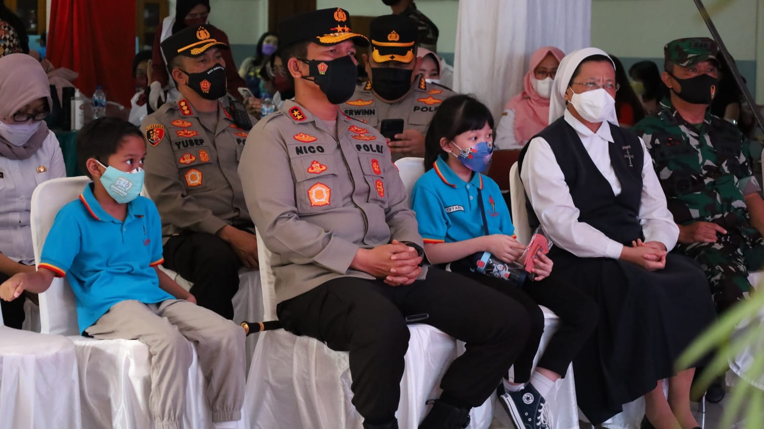 Kapolda Jatim Irjen Pol Nico Afinta bersama Forkopimda Kota Surabaya, Rabu (5/1/2022) siang, melakukan pengecekan vaksinasi Merdeka Anak usia 6-11 tahun, di SD Katolik Santa Clara, Ngagel Madya, Surabaya. Selain itu, kegiatan serupa juga dilakukan di 115 titik gerai vaksin yang tersebar di seluruh Jawa Timur, dengan target 25.000 dosis pada hari ini dari target 2,5 juta dosis untuk anak seluruh jatim, dan dilaunching seluruh Indonesia oleh Kapolri yang dihadiri oleh Menko PMK RI dan Wamenkes RI serta dilakukan dialog interaktif secara virtual.
