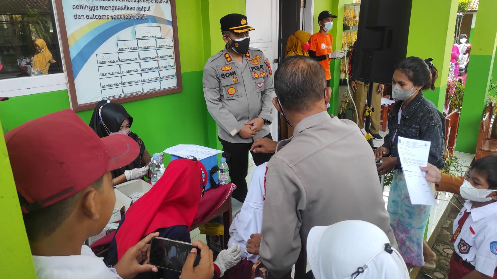 Kapolres Ciamis AKBP Wahyu Broto Narsono Adhi, S.I.K., M.Sc.Eng., meninjau langsung pelaksanaan vaksinasi merdeka untuk anak di wilayah Kabupaten Pangandaran. Vaksinasi Merdeka Anak salah satunya digelar di SDN 6 Pangandaran, Kabupaten Pangandaran, Jawa Barat, Senin (10 Januari 2022).