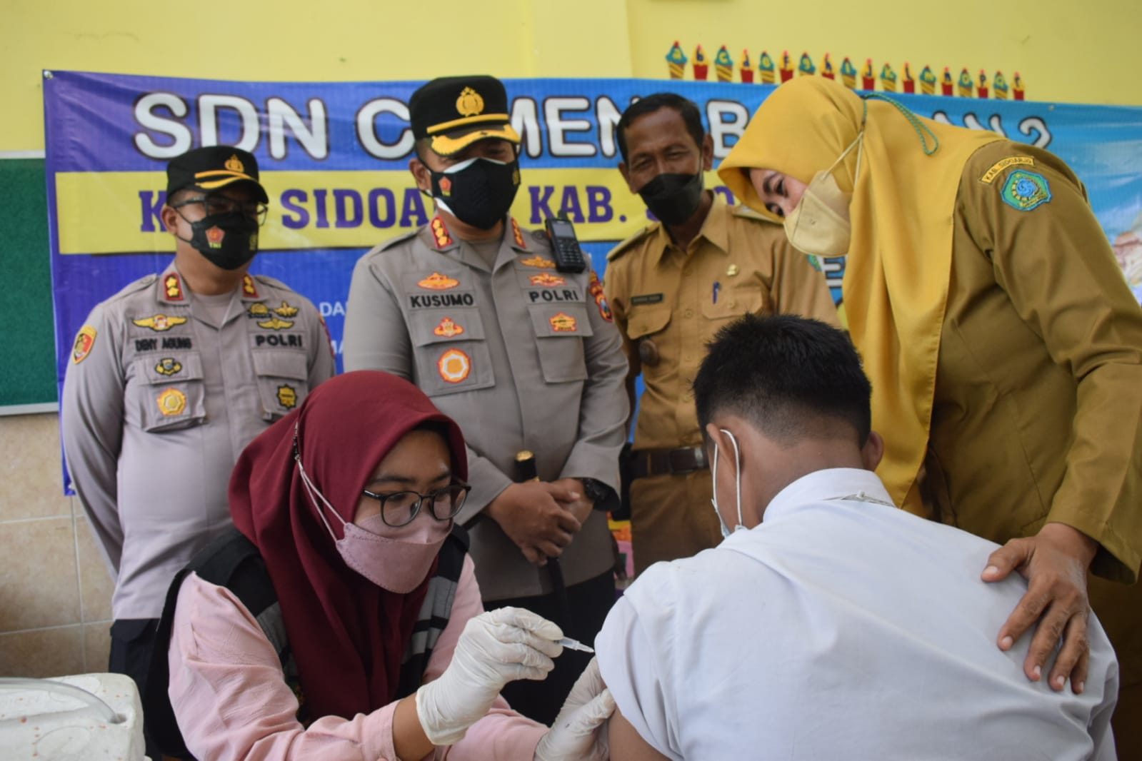 Akhir Januari 2022 vaksinasi anak usia 6 sampai 11 tahun ditarget telah mencapai 70 persen. Polresta Sidoarjo bersama TNI, Dinas Kesehatan dan instansi terkait terus berupaya menggencarkan vaksinasi ke sekolah-sekolah.