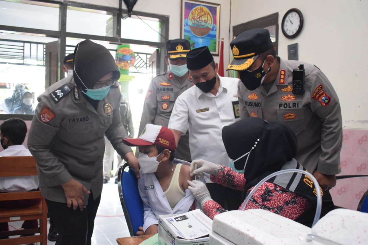 Sebanyak 500 murid Madrasah Ibtidaiyah Negeri (MIN) 1, Banjarkemantren, Buduran, Sidoarjo, mendapatkan suntikan Vaksin Covid-19 jenis Sinovac dari tenaga kesehatan Polresta Sidoarjo bersama instansi terkait, Senin (10/1/2022).