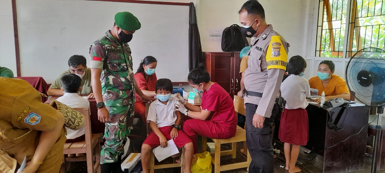 Plh Danramil 1013-13/Sungai Babuat dampingi tim kesehatan melKsanakan kegiatan vaksinasi untuk anak-anak usia 6 s.d 11 tahun di SDN Tambelum Kec. Sungai Babuat Kab. Murung Raya. Selasa (11/1/2022)