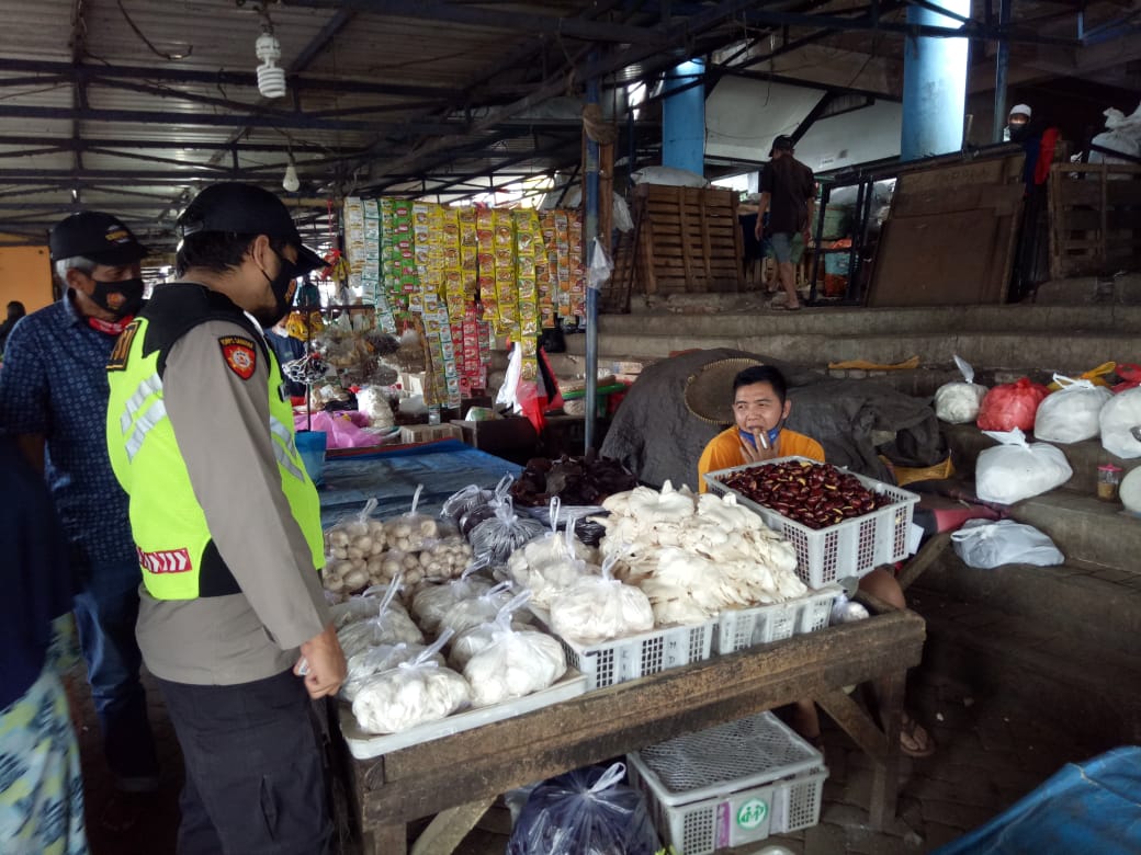 Kepala Kepolisian Sektor Lawang (Kapolsek Lawang) Komisaris Polisi (Kompol) Yatmo bersama 2 (dua) anggota Bripka Aris dan Bripka Agus, melaksanakan pengecekan harga sembako atau bahan pokok di Pasar Tradisional, Kecamatan Lawang, Kabupaten Malang, Rabu (12/01/2021).