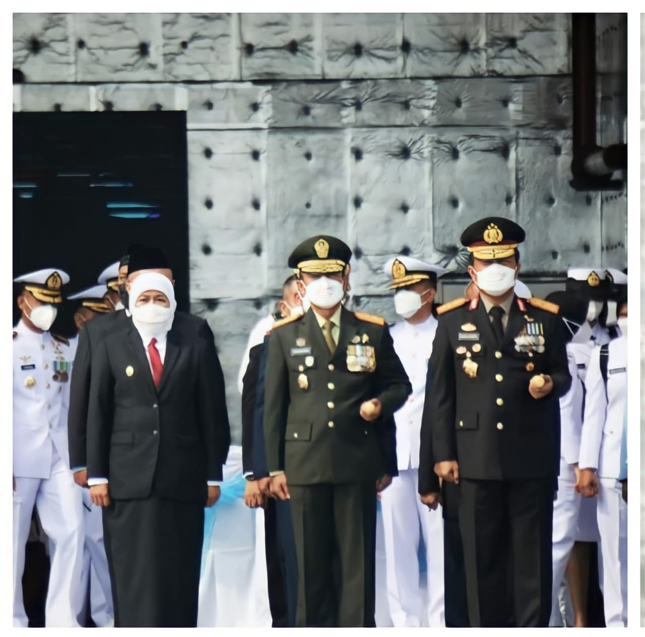 Forkopimda Jatim mengikuti pelaksanaan Upacara Tabur Bunga memperingati Hari Dharma Samudera di Hanggar Heli KRI dr.Wahidin Sudirohusodo-991, pada Sabtu, (15/1/2022).