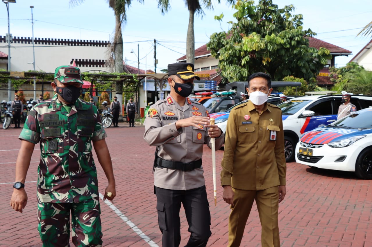 Kapolres Malang AKBP Bagoes Wibisono bersama Dandim 0818 Kabupaten Malang-Batu Letkol Inf Taufik Hidayat dan Sekda Kabupaten Malang Dr. Ir. Wahyu Hidayat laksanakan Apel Gelar Pasukan Pamor Keris Patroli Motor Penegakan Protokol Kesehatan di Masyarakat di Wilayah Hukum Kabupaten Malang, Senin (24/01/2022).