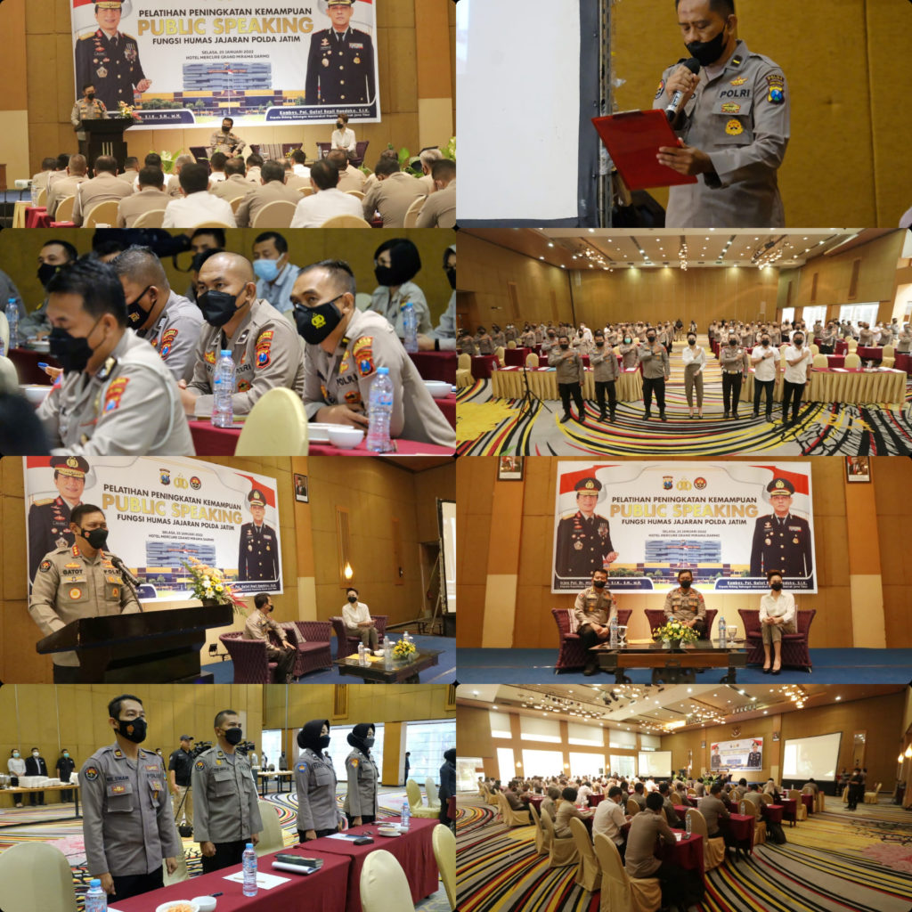 Bidang Humas Polda Jatim menggelar Pelatihan Peningkatan Kemampuan Public Speaking Fungsi Humas Jajaran Polda Jatim di Ballroom Hotel Mercure Surabaya, pada Selasa (25/1/2022).