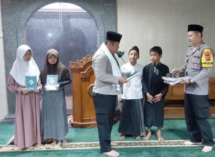 Kegiatan Wakapolres selanjutnya Shalat Subuh Berjama’ah dilanjutkan Tausiyah serta mempersembahkan bingkisan Al-Qur’an dan Alat Shalat kepada 4 anak yatim piatu DKM Al Azhariyah. Hms/Deded. Skr
