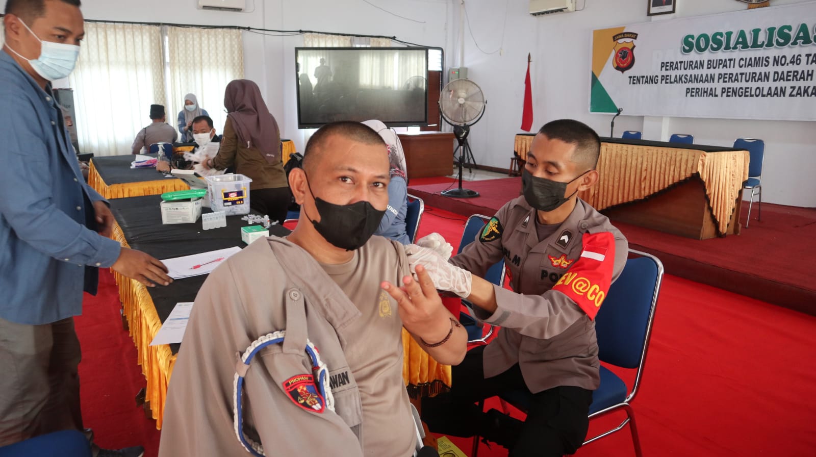 Kepolisian Resor Ciamis Polda Jabar menggelar vaksinasi booster di gerai Vaksinasi Presisi. Gerai vaksinasi ini digelar di Aula Pesat Gatra Mapolres Ciamis, Jalan Jend. Sudirman No.271, Sindangrasa, Kecamatan Ciamis, Kabupaten Ciamis, Jawa Barat, Jumat (28/01/2022).