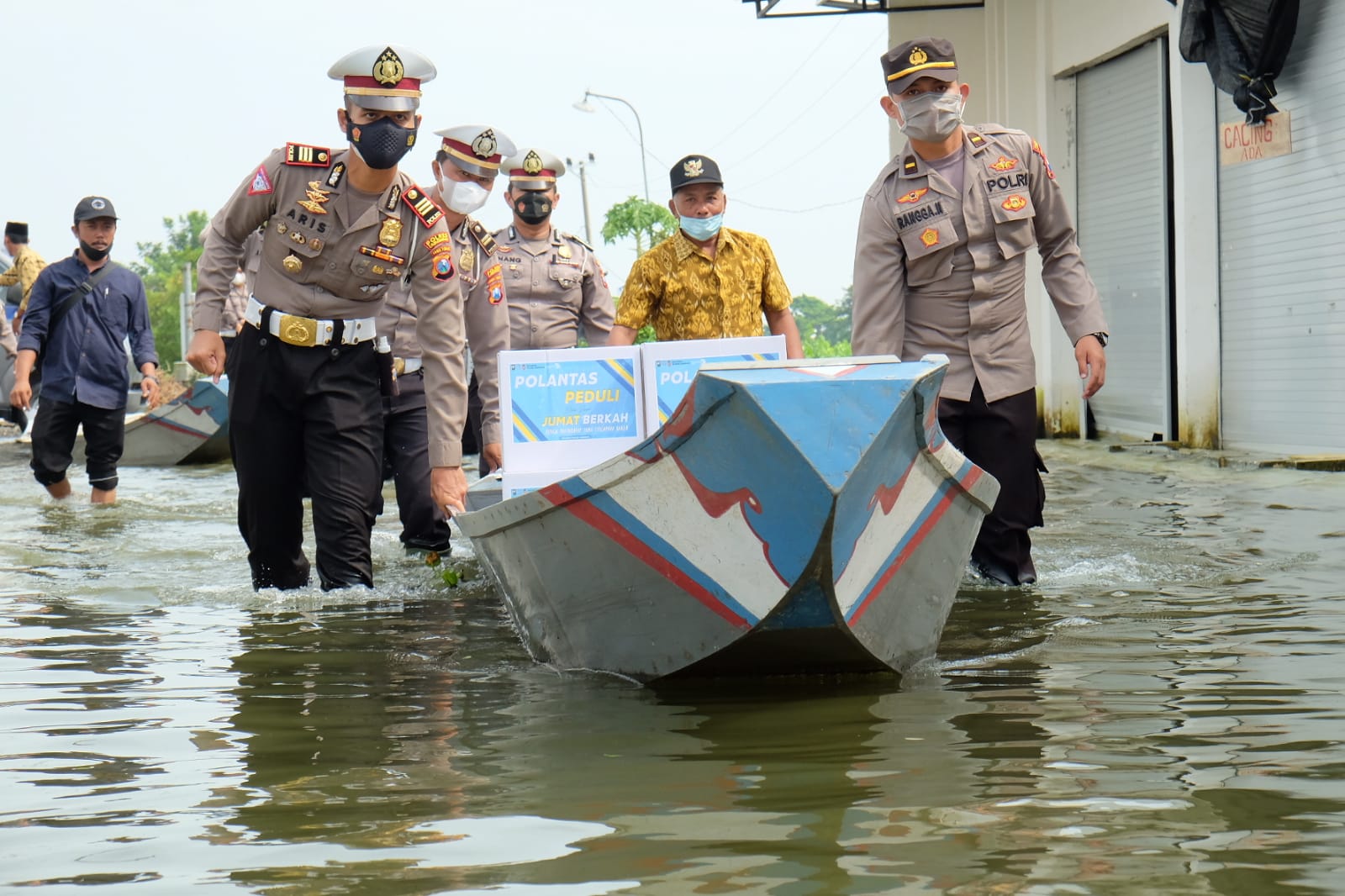 Dengan menggunakan perahu Kasat Lantas bersama dengan para perwira Lantas menyambangi satu per satu rumah warga yang terisolir dan memberikan bantuan kemanusiaan tersebut.
