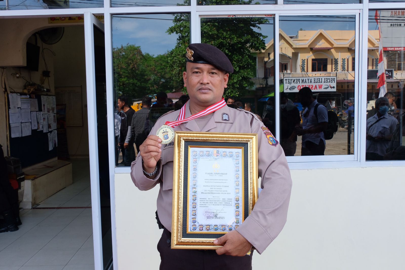 Inilah yang membuat saya hari ini hadir di sini dan memberikan reward kepada sahabat kita semua, sosok pelindung pengayom dan pelayan masyarakat. Saya perintahkan semua personel Polda Riau mencontoh sosok Bripka Okvanianus Yusbar,” ungkap Kapolda Riau