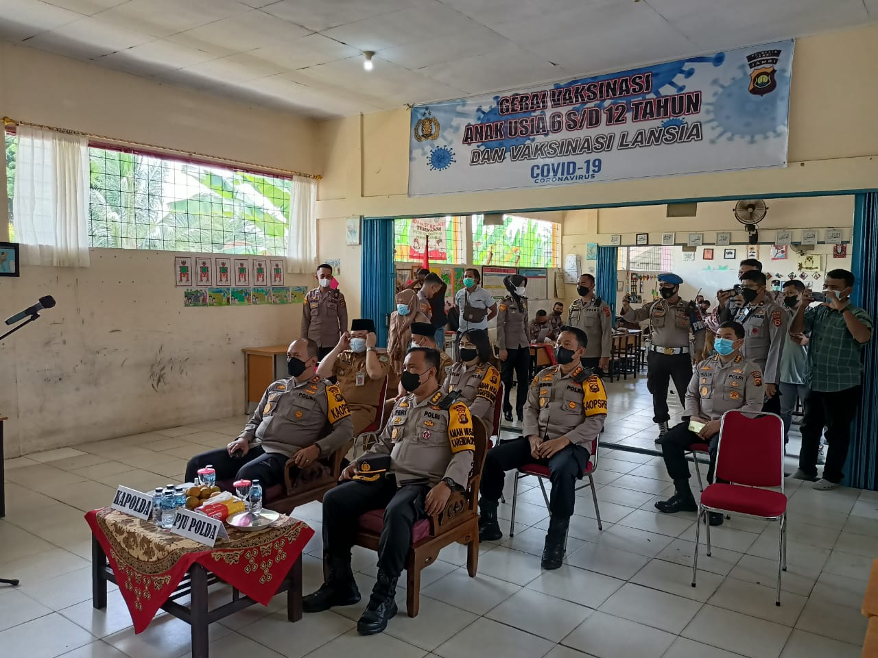 Kapolda Jambi Irjen Pol A Rachmad Wibowo SIK Disertai Karo Ops Kombes Pol Feri Handoko Soenarso, dan Kapolresta Jambi Kombes Pol Eko Wahyudi SIK MH meninjau dan mengikuti kegiatan Kapolri dan Menteri Kesehatan melalui vicon terkait pelaksanaan pelaksanaan serentak anak dan lansia se Indonesia di gerai vaksianasi di SDN 66 Kota Jambi .