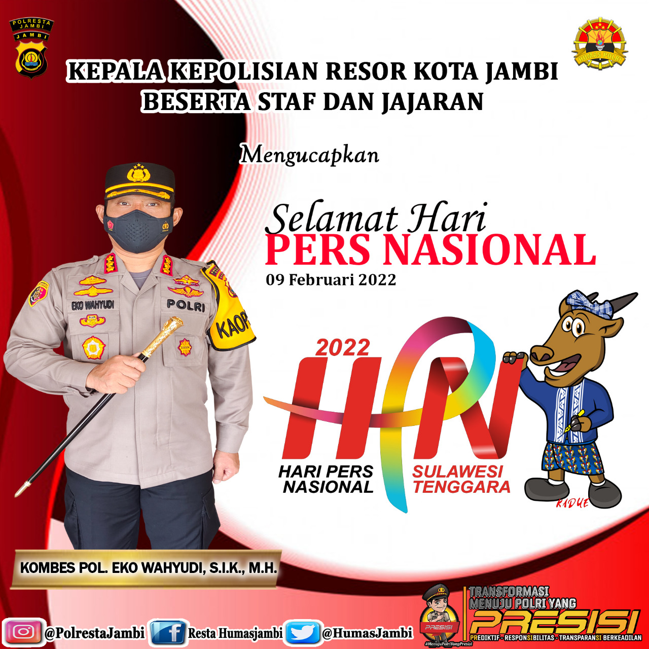 Kapolresta Jambi Kombes Pol Eko Wahyudi SIK MH bersama jajaran Polresta Jambi mengucapkan selamat dan sukses untuk Hari Pers Nasional yang jatuh pada tanggal 09 Februari 2022.