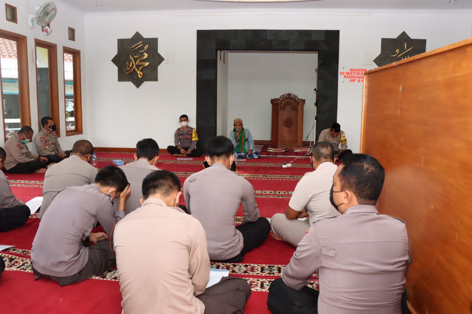 Personel Polres Banjar yang Muslim mengikuti binrohtal di Masjid At-Taubah Polres Banjar dipimpin oleh Wakapolres Banjar Kompol Lalu Wira Sutriana K.,Amd. dan diikuti oleh perwakilan Personel Polres Banjar demi mematuhi protokol kesehatan sedangkan personel Muslim lainnya mengikuti binrohtal secara virtual.