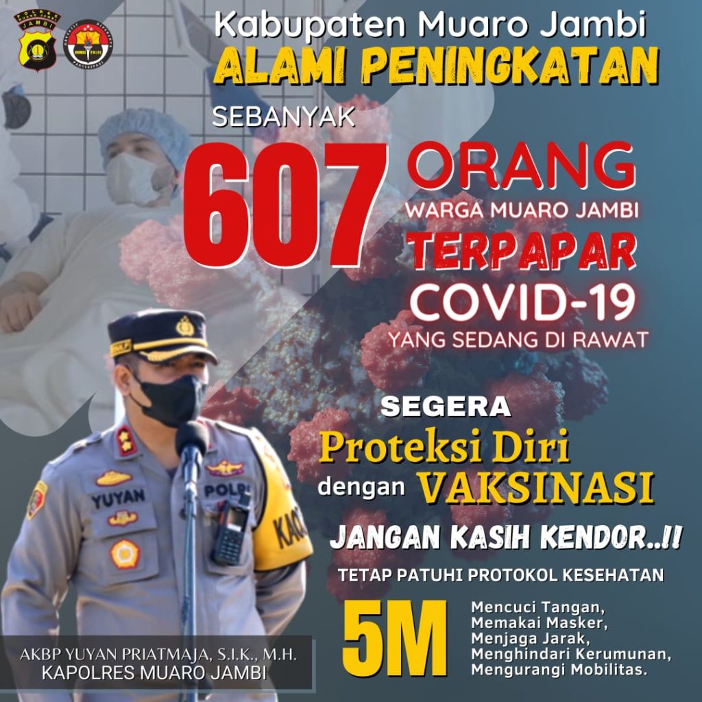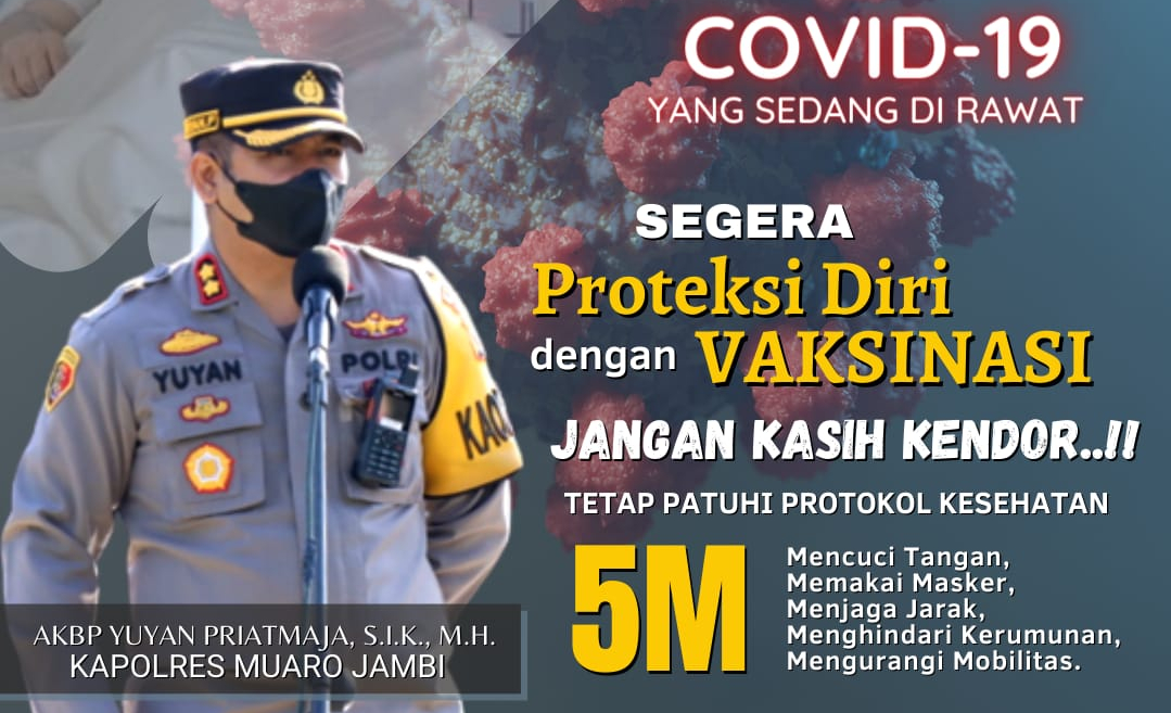 Kapolres Muaro Jambi AKBP Yuyan Priatmaja SIK MH melalui Kasi Humas AKP Amradi SE menghimbau kepada masyarakat Muaro Jambi untuk proteksi diri dengan vaksinasi serta tetap disiplin protokol kesehatan dengan 5 M (Mencuci tangan , Memakai Masker, Menjaga Jarak , Kerumunan dan Mengurangi Mobilitas )