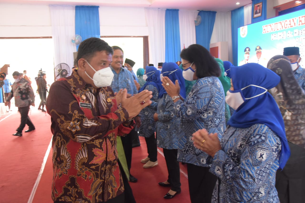 Wakil Bupati Deli Serdang HM. Ali Yusuf Siregar sambut langsung kunjungan kerja Kepala BKKBN RI DR.(HC) dr. Hasto Wardoyo, Sp.OG (K), dalam rangka deklarasi tim pendamping keluarga se Kabupaten Deli Serdang sekaligus pencanangan Bakti Sosial Ikatan Bidan Indonesia (IBI) Bangga Kencana Kesehatan Tahun 2022 yang ditandai dengan pemukulan gong, di Balairung Pemkab Deli Serdang, Kamis (10/3/2022).