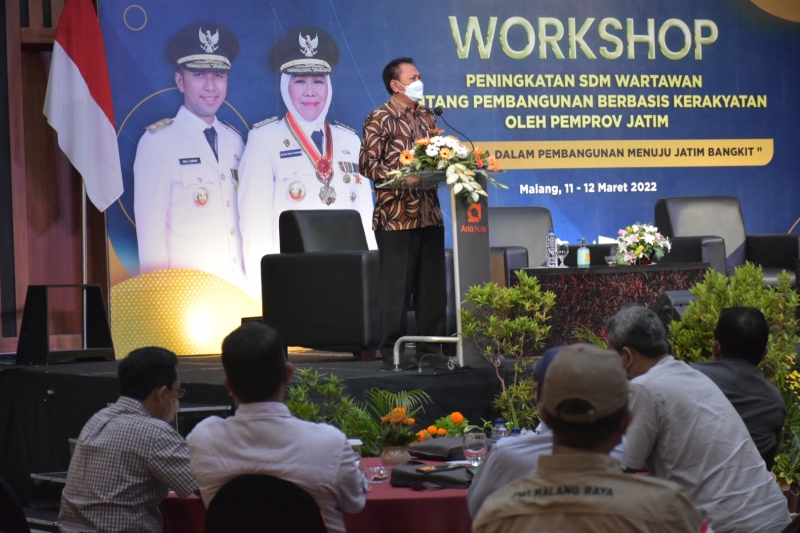 Dinas Komunikasi dan Informatika (Diskominfo) Provinsi Jawa Timur (Jatim) menggelar workshop peningkatan SDM wartawan tentang pembangunan ekonomi berbasis kerakyatan di Hotel Aria Gajayana Kota Malang, Jawa Timur, Jumat (11/3/2022).