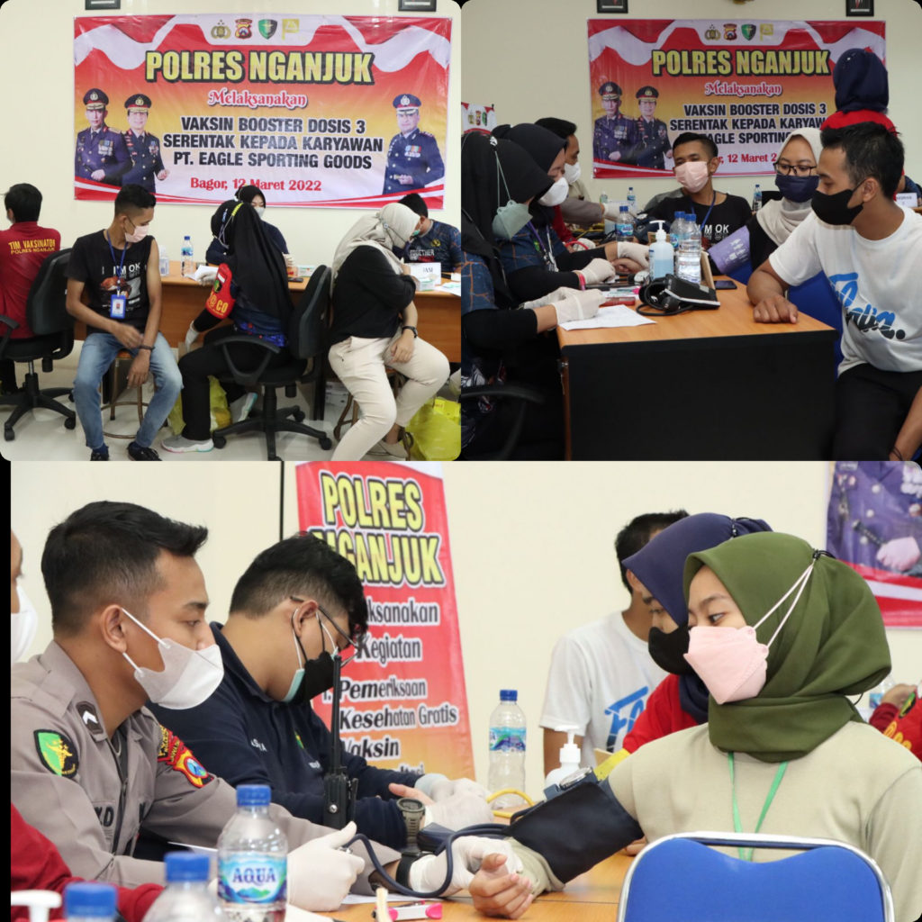 Kapolres Nganjuk AKBP. Boy Jeckson S., S.H.,S.I.K.,M.H. menyebut percepatan vaksinasi secara berkesinambungan menjadi syarat mutlak terciptanya kekebalan kelompok (herd immunity) menjelang bulan puasa sebagaimana dicanangkan Presiden Joko Widodo. Hal teraebut disampaikan AKBP Boy Jeckson usai memantau pelaksanaan vaksinasi serentak di pabrik tas PT Eagle Sporting Goods di wilayah Bagor, Nganjuk, Sabtu (12/3/2022).