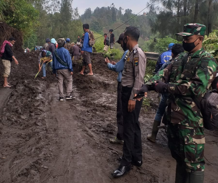 Sejak kemarin malam petugas BPBD dan Tagana setempat bersama TNI/Polri dan warga Tengger bahu membahu membersihkan material longsoran dengan alat seadanya. Tadi pagi jalan warga dan jalan wisata itu bisa dilintasi.