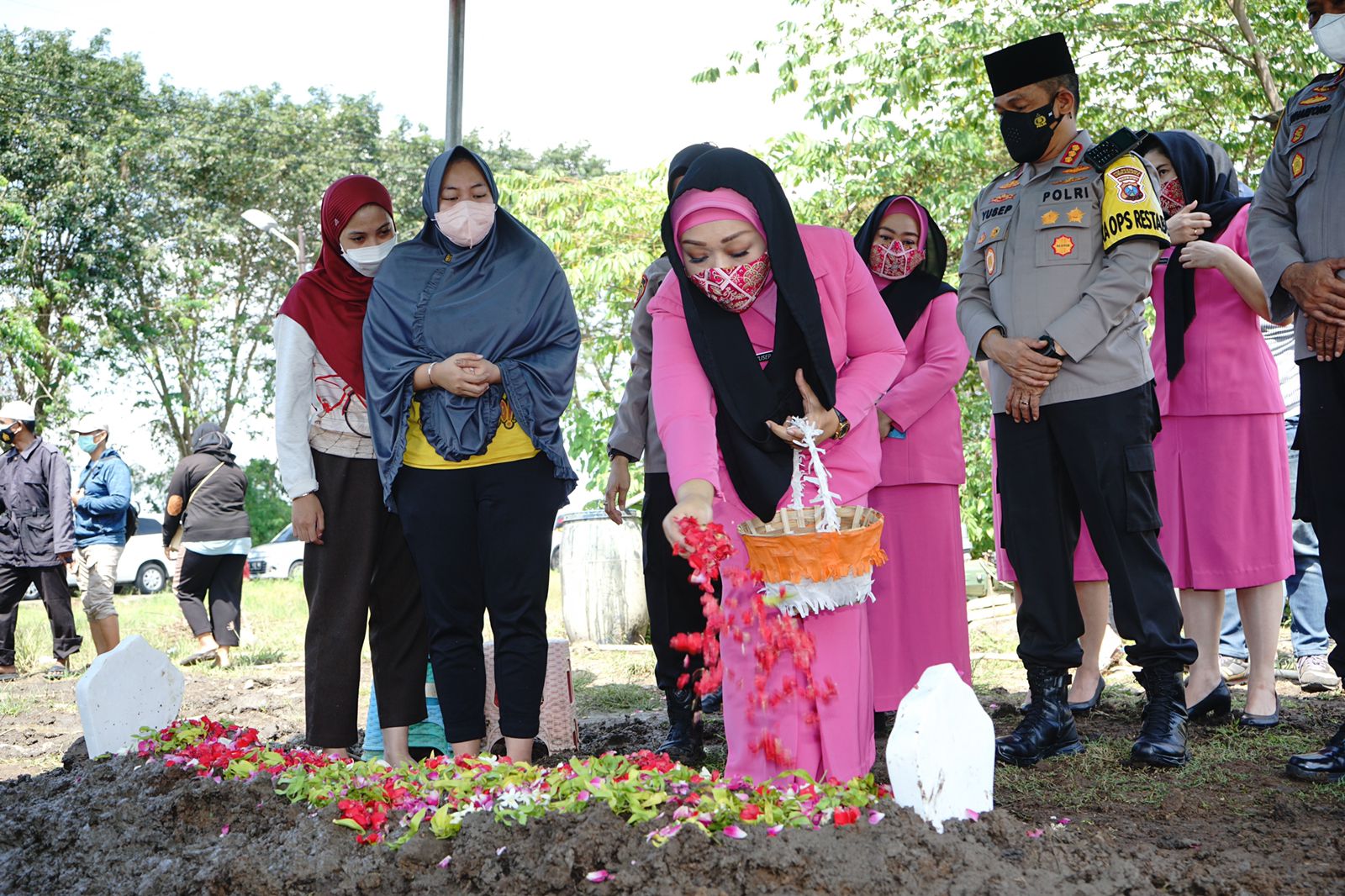 Kapolrestabes Surabaya, Kombes Pol Akhmad Yusep Gunawan, SH, SIK, MH bersama Ketua Bhayangkari Kota Besar Surabaya, Ny. Gita Yusep dan PJU (Pejabat Utama) Polrestabes Surabaya menghadiri upacara Pemakaman Almarhum Aiptu Moediharto Panit Samapta Polsek Gayungan.