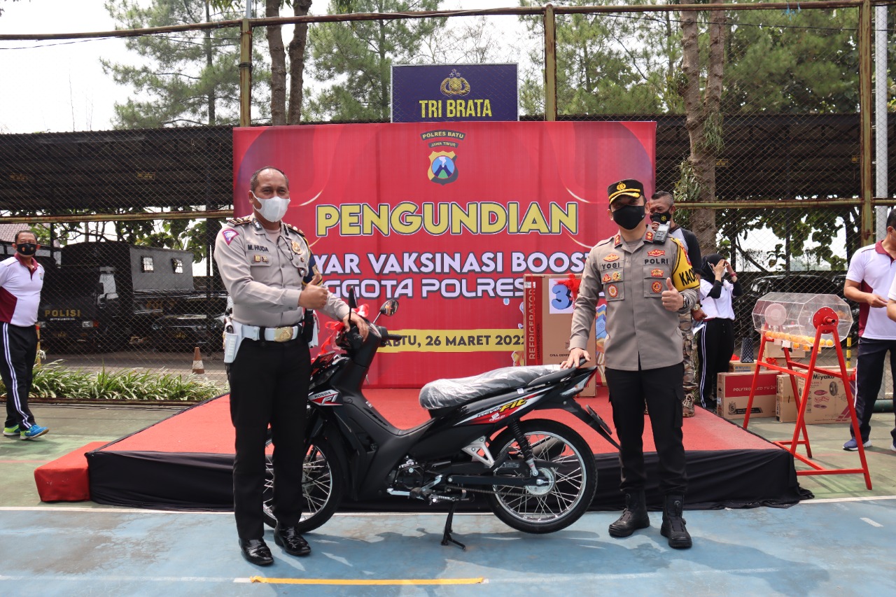 Polres Batu kembali membagikan doorprize kepada anggota Polres Batu yang sudah melakukan vaksinasi dosis booster dalam kegiatan olah raga pagi yang dilaksanakan setiap hari Sabtu.