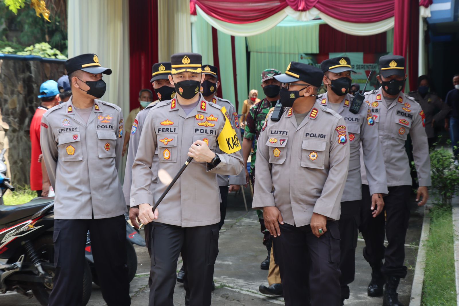Kapolres Malang AKBP Ferli Hidayat bersama Kasat Binmas Polres Malang AKP Indra Subekti didampingi Kapolsek Pakis AKP Moh. Lutfi meninjau langsung Gebyar Vaksinasi Lansia Dosis I, Dosis II dan Vaksinasi Booster yang dilaksanakan secara Rayonisasi di Gedung KPRI Mekar Guna, Jalan Ledokdowo Pakisjajar, Kecamatan Pakis, Kabupaten Malang, Selasa (12/04/2022)