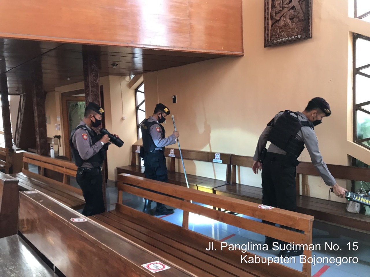 Polres Bojonegoro menggelar sterilisasi dan memberikan pengamanan ketat di gereja-gereja atau tempat ibadah Umat Nasrani di Bojonegoro dalam rangka memperingati hari Wafatnya Isa Al-Masih atau Jum’at Agung.