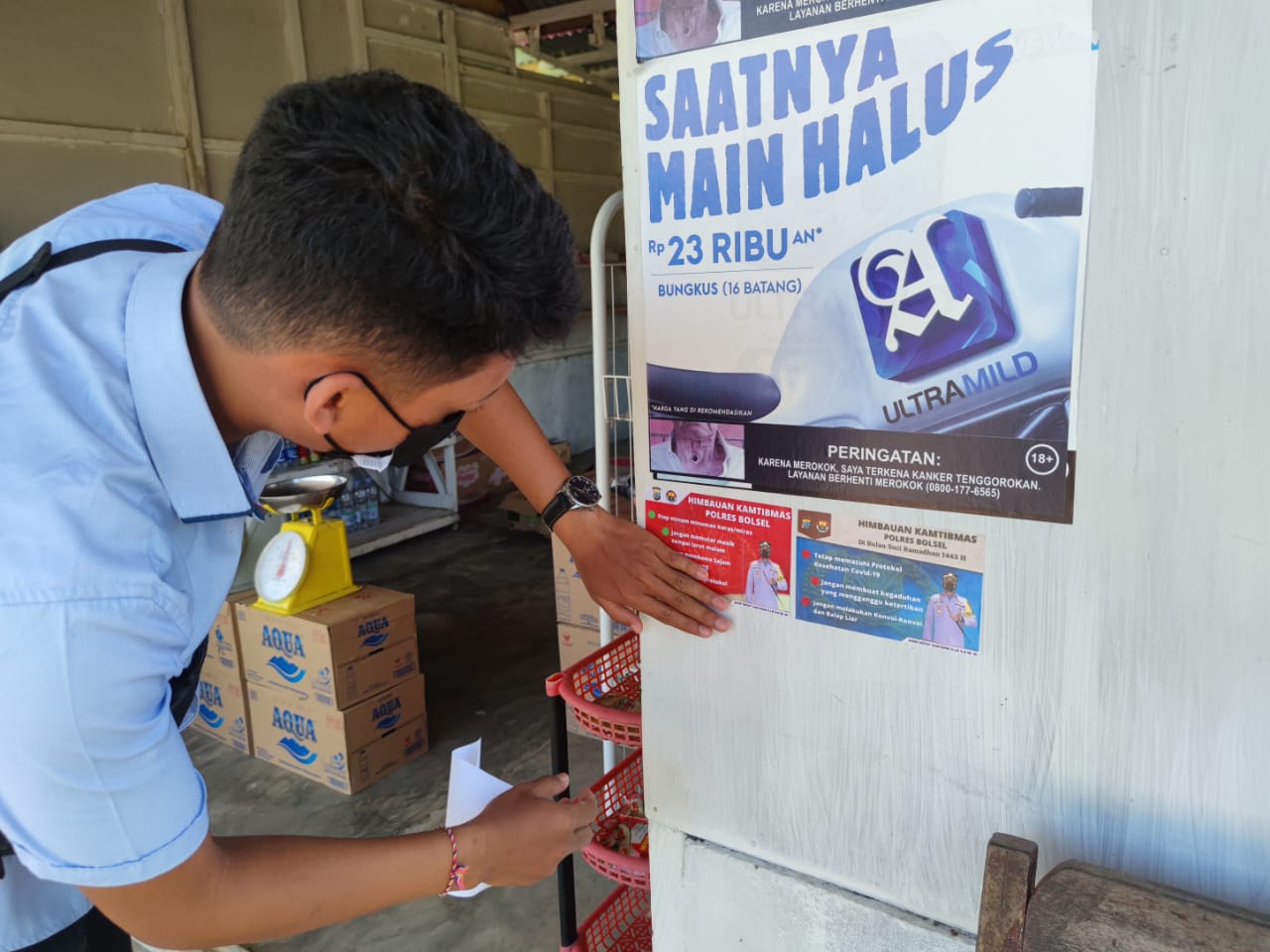 Penempelan Stiker himbauan kamtibmas dan pencegahan covid 19 dilaksanakan di tempat umum toko, warung, pelayanan publik diwilayah kecamatan Bolaang Uki Kabupaten Bolmong Selatan. Selasa, 19/04/2022