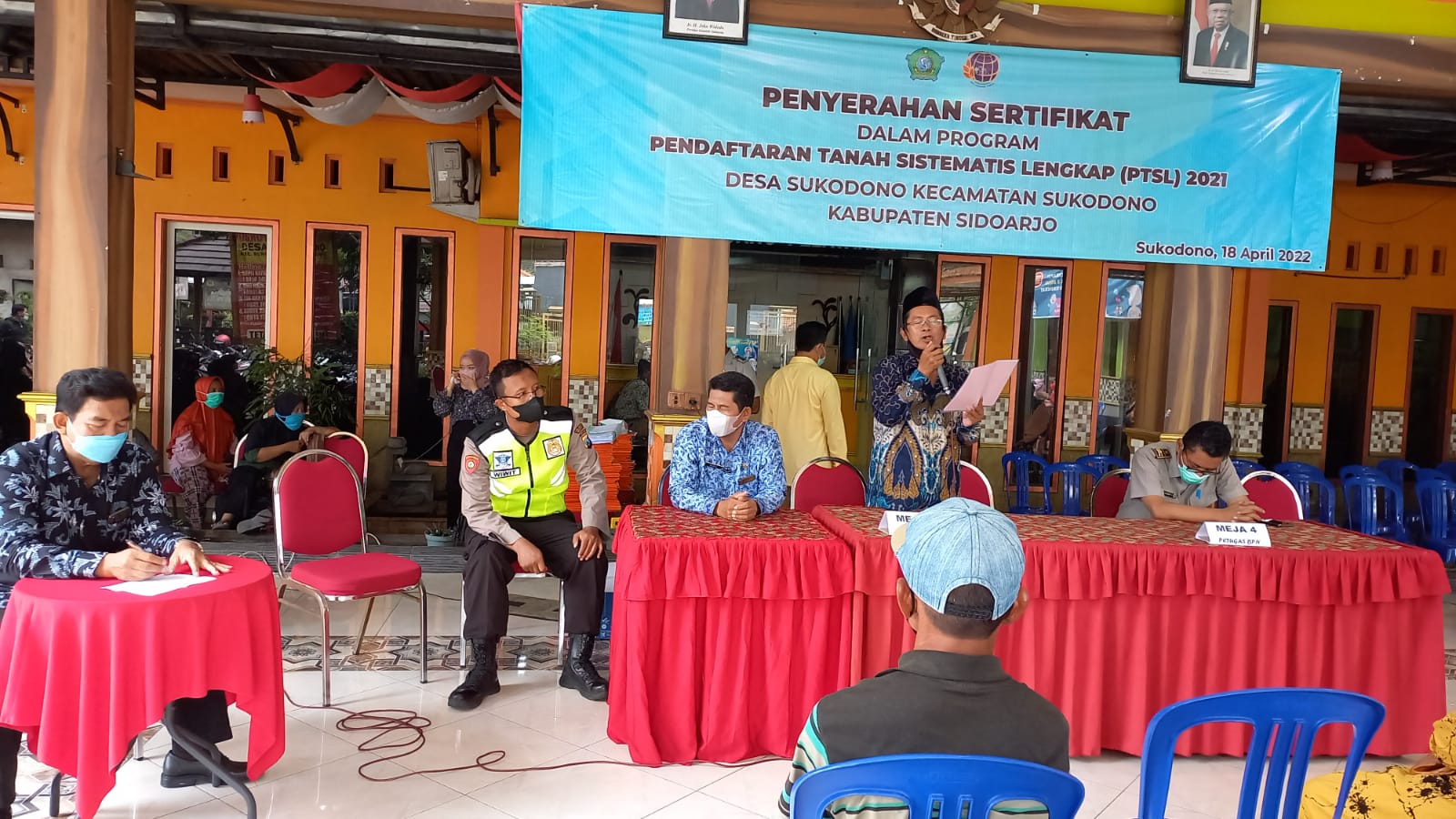 Hadir di acara penyerahan pembagian sertifikat, Kepala Desa Sukodono, beserta perangkat Desa Sukodono, pendamping Desa Sukodono, Serka Muhedi dari Koramil Sukodono, Ketua PTSL Sukodono, petugas BPN Sidoarjo, dan Aipda Wiwit Yulianto SH PS Kanit Samapta Polsek Sukodono selaku bhabinkamtibmas pemdes Sukodono, dan 128 warga desa Sukodono penerima Sertifikat tersebut. Hari Senin 18 April 2022 jam 09.00 sd selesai.