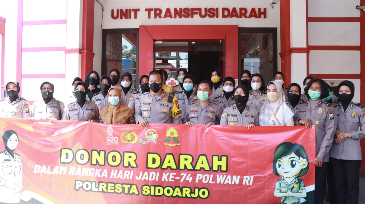 Menyambut peringatan 74 tahun Polisi Wanita (Polwan), sejumlah Polwan Polresta Sidoarjo dan polsek jajaran melakukan donor darah di PMI Sidoarjo, Kamis (28/7/2022).