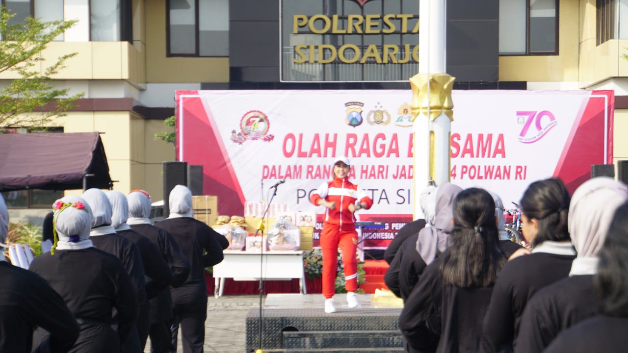 Olahraga bersama dikolaborasikan dengan aneka macam perlombaan, dalam rangka menyambut Hari Ulang Tahun Polisi Wanita (Polwan) Republik Indonesia ke-74 yang digelar di Polresta Sidoarjo, Sabtu (27/8/2022) pagi berlangsung meriah.