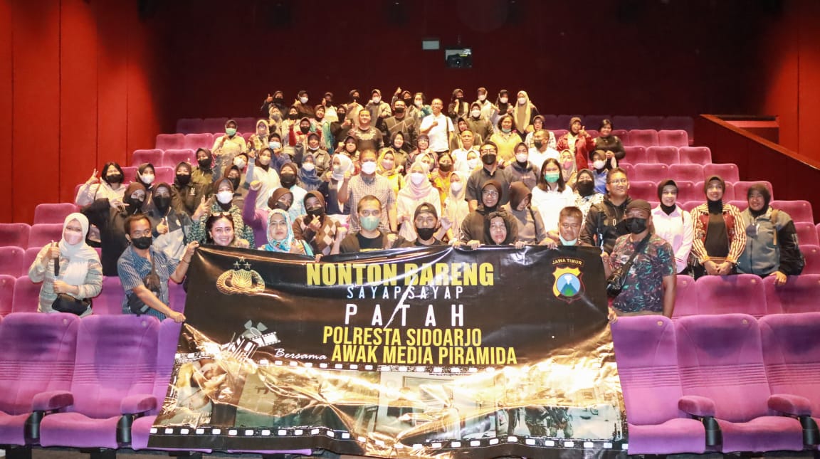 Kapolresta Sidoarjo Komisaris Besar Polisi Kusumo Wahyu Bintoro, bersama pejabat utama, polwan dan awak media piramida Sidoarjo nonton bareng film Sayap-Sayap Patah di XXI Transmart, Sidoarjo, Selasa (30/8/2022).