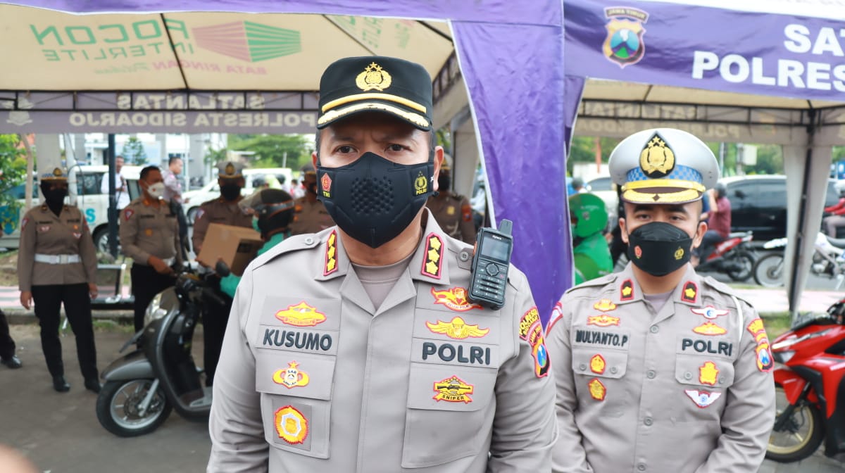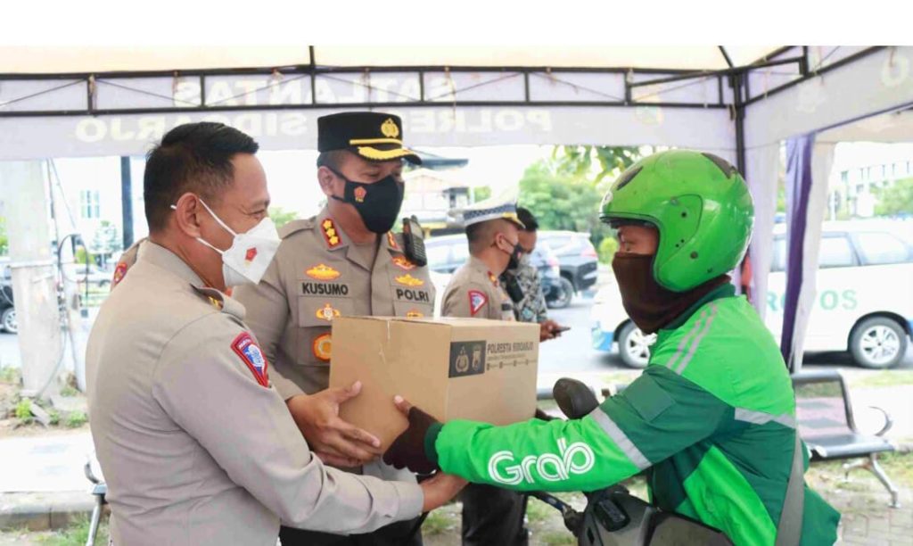 Kapolresta Sidoarjo Kombes Pol. Kusumo Wahyu Bintoro didampingi Kasat Lantas Polresta Sidoarjo Kompol Yanto Mulyanto membagikan paket sembako kepada pengendara ojol di sekitar Taman Pinang Indah Sidoarjo.