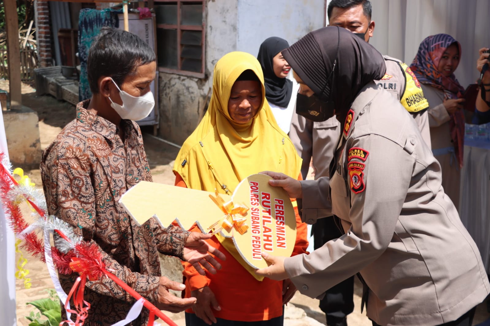 Acara dengan penentuan kunci Rumah Layak Huni dari Kapolres Subang kepada penerima manfaat Sunarto/Laela dengan dilakukan gunting pita, rumah dan juga digelarnya Sembako kepada warga setempat yang membutuhkan. (Hms)