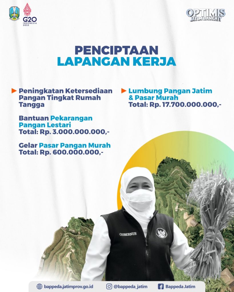 “Tidak hanya itu, kami juga terus mengoptimalkan program dan kegiatan melalui Optimis Jatim Bangkit, yaitu, Optimis Bangkit dalam Pemulihan Ekonomi Jawa Timur yang fokus pada menggerakkan kembali Agro Industri, Pariwisata dan Investasi untuk menyerap tenaga kerja yang kehilangan pekerjaan,” tandas Gubernur Khofifah.