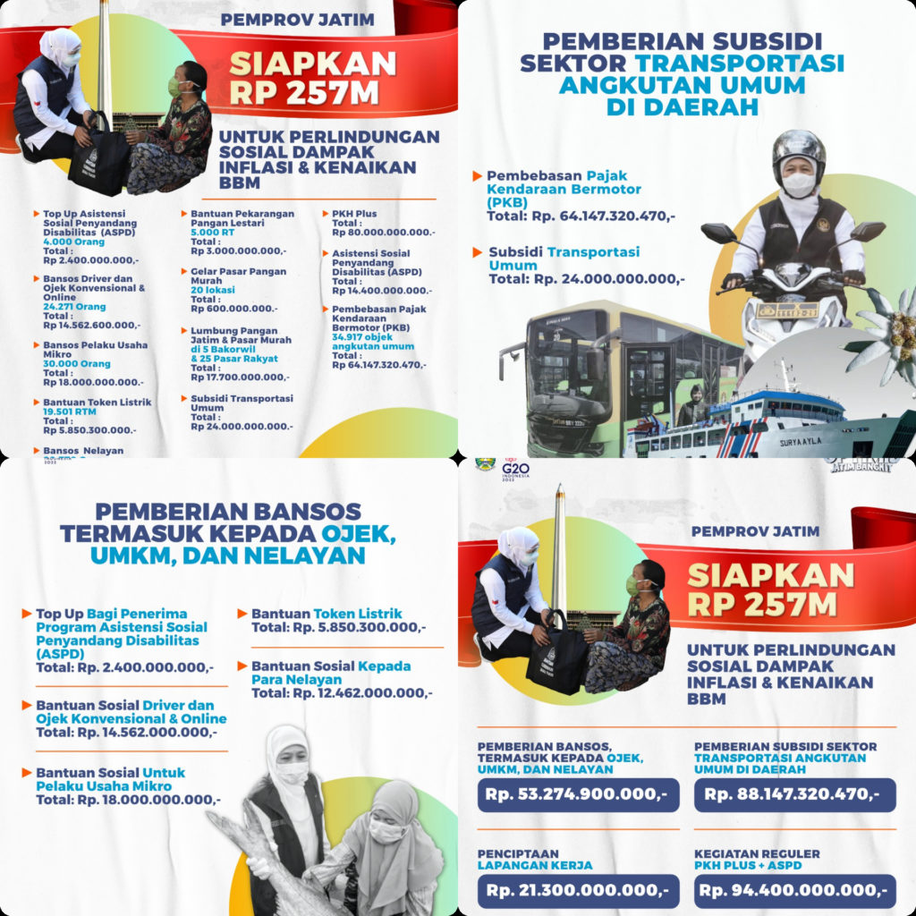 “Mari kita antisipsi semua situasi ini dengan baik sehingga daya beli masyarakat tetap tinggi, salah satunya melalui bantalan-bantalan ekonomi dan sosial ini. Itulah kenapa kita meluncurkan total ada Rp. 257 Miliar untuk bantalan ekonomi dan bantalan sosial di dalam proses pengendalian inflasi di Jawa Timur,” katanya.