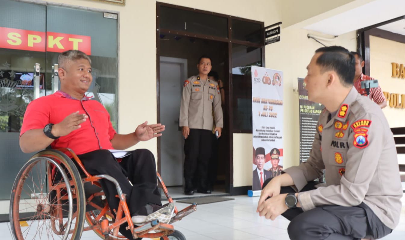 Dalam kunjungannya tersebut Agung, begitu ia akrab disapa, disambut hangat oleh AKBP Ferli sejak dari depan ruang Sentra Pelayanan Kepolisian Terpadu (SPKT) Polres Malang. Tampak Kapolres juga membantu mendorong kursi roda yang digunakan oleh Agung menuju kedalam ruang Bagops Polres Malang.