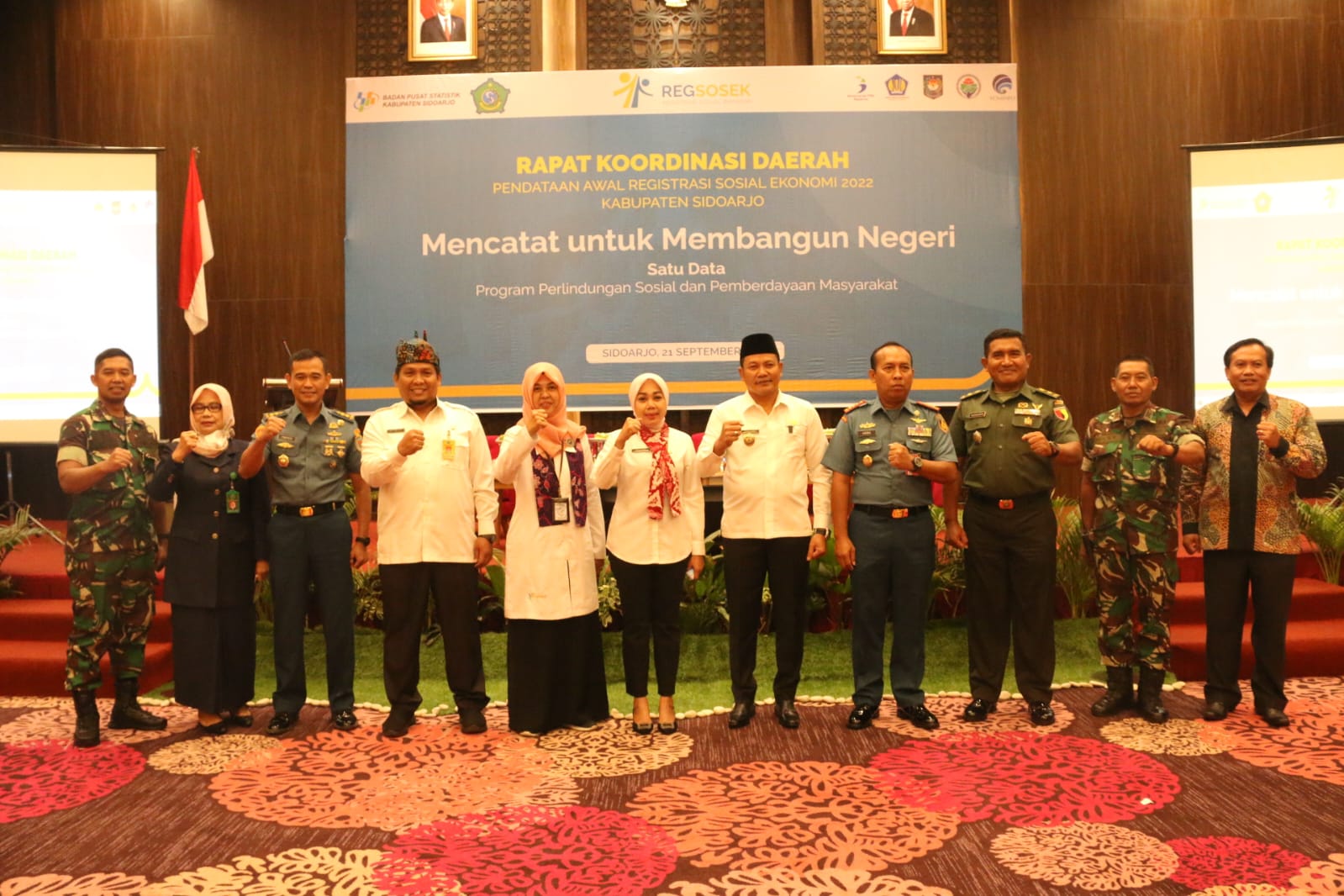 Satu Data Program Perlindungan Sosial dan Pemberdayaan Masyarakat coba diwujudkan Pemerintah Kabupaten Sidoarjo bersama Badan Pusat Statistik/BPS Kabupaten Sidoarjo. Langkah awal dengan melakukan pendataan awal Registrasi Sosial Ekonomi/Regsosek tahun 2022 dengan menggelar Rakor Daerah/Rakor Pendataan Awal Registrasi Sosial Ekonomi tahun 2022, Rabu 21/09/2022 di Fave Hotel Sidoarjo. Kegiatan yang mengambil tema “Mencatat untuk Membangun Negeri 1 Data Program Perlindungan Sosial dan Pemberdayaan Masyarakat” itu dibuka secara resmi oleh Wakil Bupati Sidoarjo H.Subandi, SH.