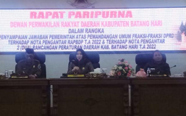 Anita Yasmin S. E ( Ketua DPRD Batanghari) dalam Pidato Pembukaannya menjelaskan ” rapat hari ini adalah Penyampaian jawaban Pemerintah  atas Pemandangan umum Fraksi-fraksi DPRD  terhadap Nota Pengantar RA PBDP tahun 2022 dan terhadap Pengantar 2(dua) rancangan Peraturan daerah kabupaten Batanghari tahun anggaran 2022,yang  nanti akan di sampaikan Oleh Pemerintah Daerah kabupaten Batanghari Yang diwakili  Wabup kita ” Jelasnya ”