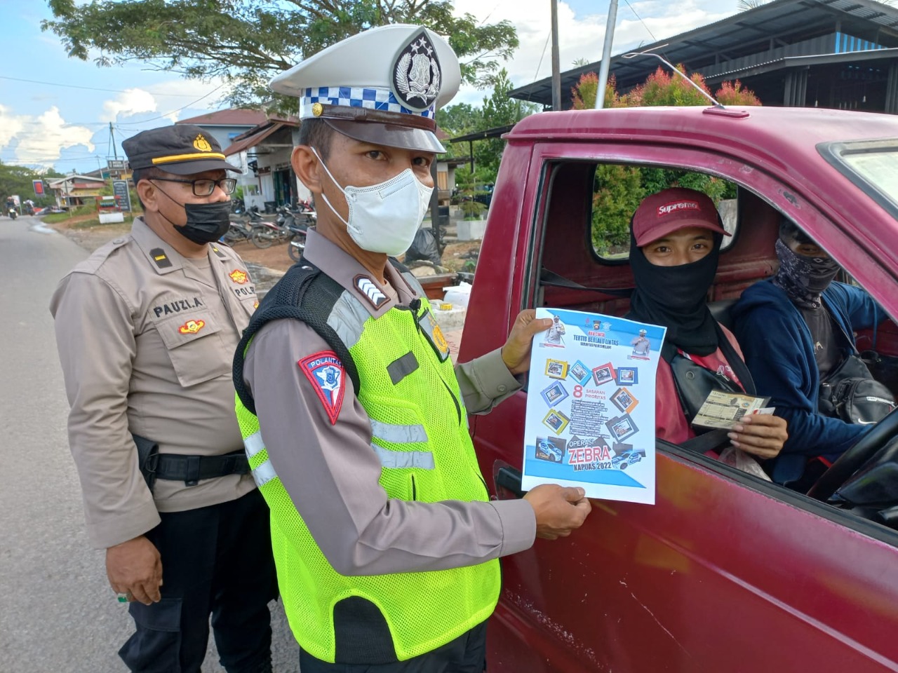 Polres Melawi Jajaran Polda Kalbar menggelar kegiatan Operasi Zebra Kapuas 2022 dengan membagikan brosur imbauan tertib dalam berlalu lintas kepada para pengendara yang melintas di depan Pos Lantas di Kecamatan Nanga Pinoh Kabupaten Melawi, Kamis (6/10/2022) pagi.