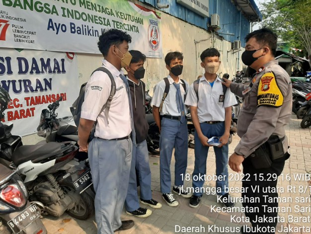 Menyikapi maraknya aksi tawuran pelajar disejumlah wilayah di Jakarta, Polres Metro Jakarta Barat dan polsek jajaran melaksanakan kegiatan program kepolisian pergi ke sekolah seperti halnya yang dilakukan oleh Bhabinkamtibmas Tamansari berkunjung melakukan observasi dan memberikan edukasi kepada para pelajar yang hendak pulang sekolah, Selasa , 18/10/2022.