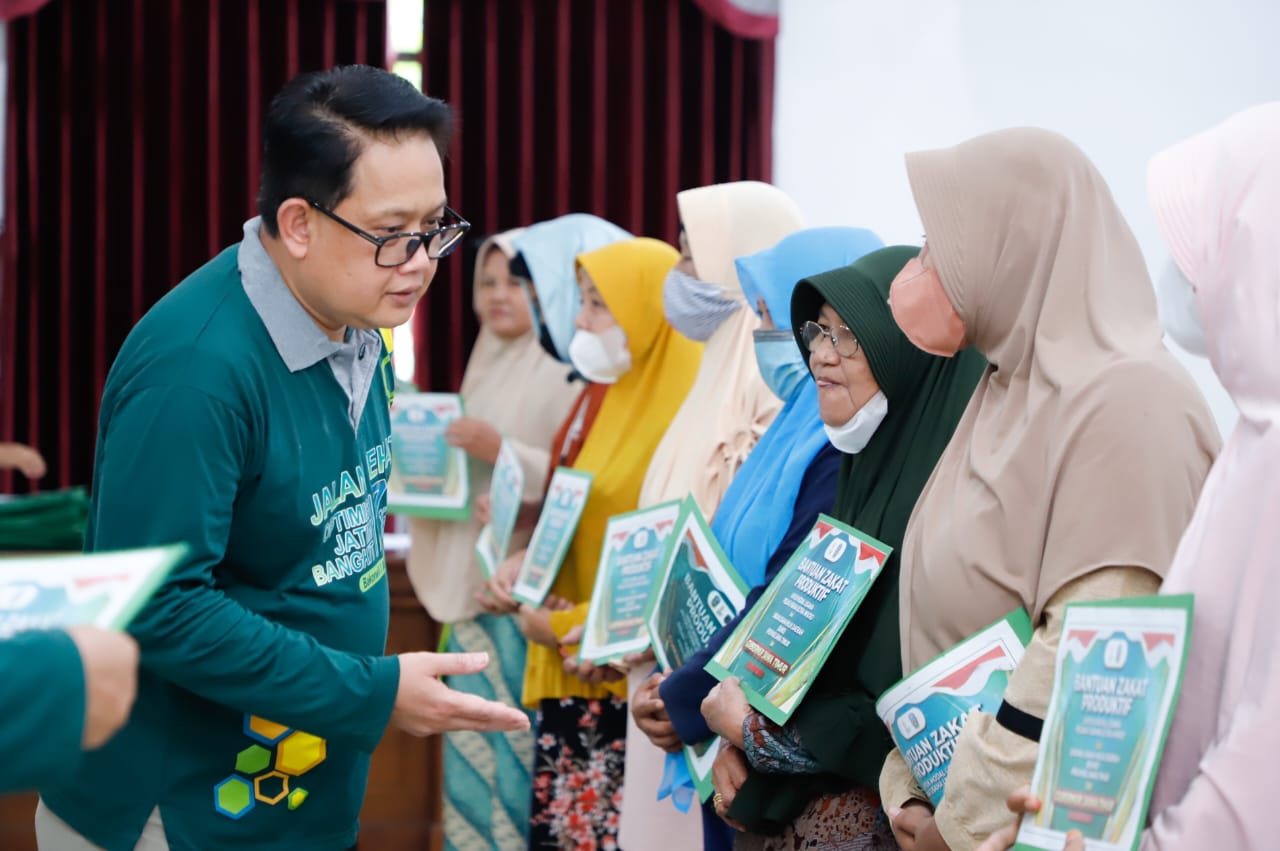 Madiun, Sekretaris Daerah Provinsi Jawa Timur, Adhy Karyono menyerahkan bantuan Zakat Produktif kepada 100 UMKM. Penyerahan bantuan ini bersamaan dengan kegiatan Jalan Sehat yang dilaksanakan di halaman Bakorwil I Kota Madiun, Sabtu (5/11/2022).