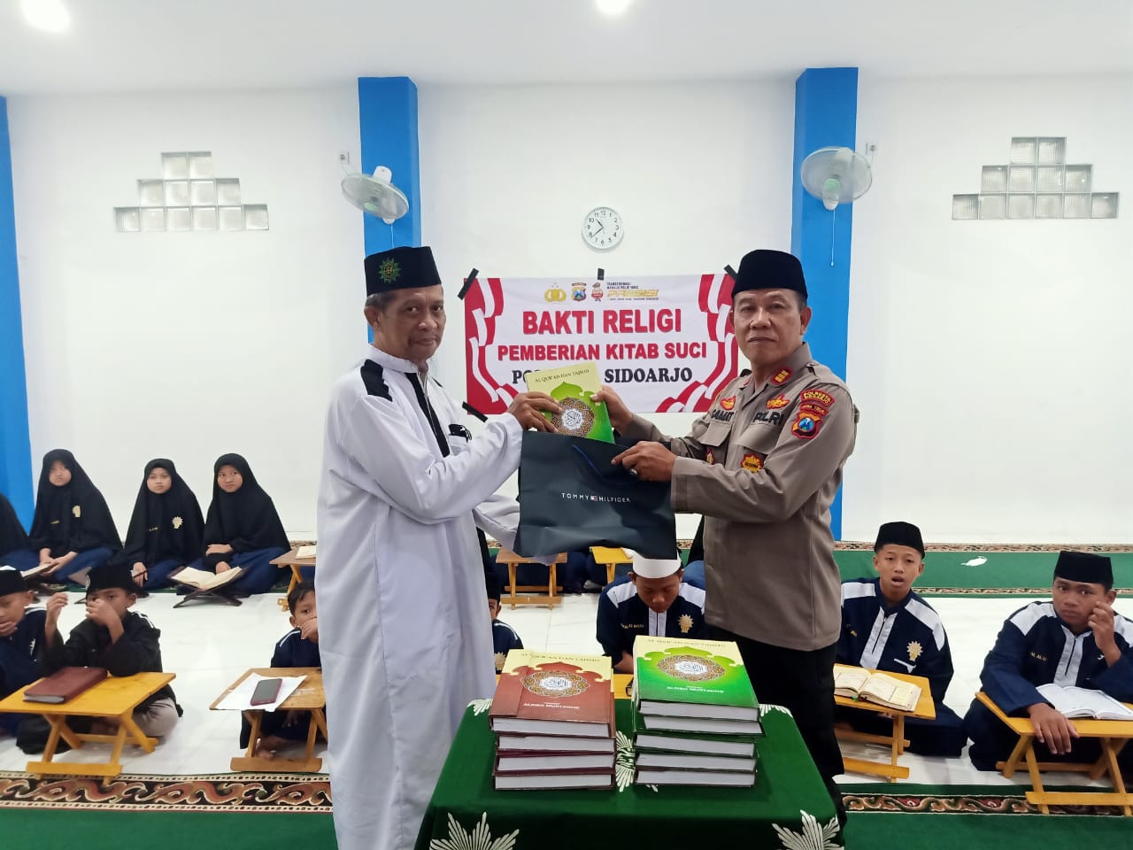 “Kapolsek Wonoayu AKP Samat SH turun ke jalan kerja bakti sosial, hari Sabtu tanggal 26/11/ 22 dimulai pukul 06.30 wib hingga selesai, melaksanakan kegiatan Bakti Sosial bersih bersih dan Bakti Religi menyalurkan pemberian Kitab Suci Al-Qur’an oleh Polsek Wonoayu di Desa Ploso dan Desa Candinegoro Kecamatan Wonoayu.