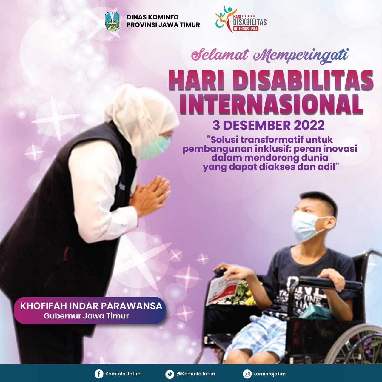 Gubernur Jawa Timur Khofifah Indar Parawansa terus mendorong peran penyandang disabilitas atau berkebutuhan khusus turut menjadi pilar utama pembangunan yang inklusif dan berkelanjutan. Pesan tersebut diungkapkannya sejalan dengan momentum Hari Disabilitas Internasional yang diperingati setiap tanggal 3 Desember.