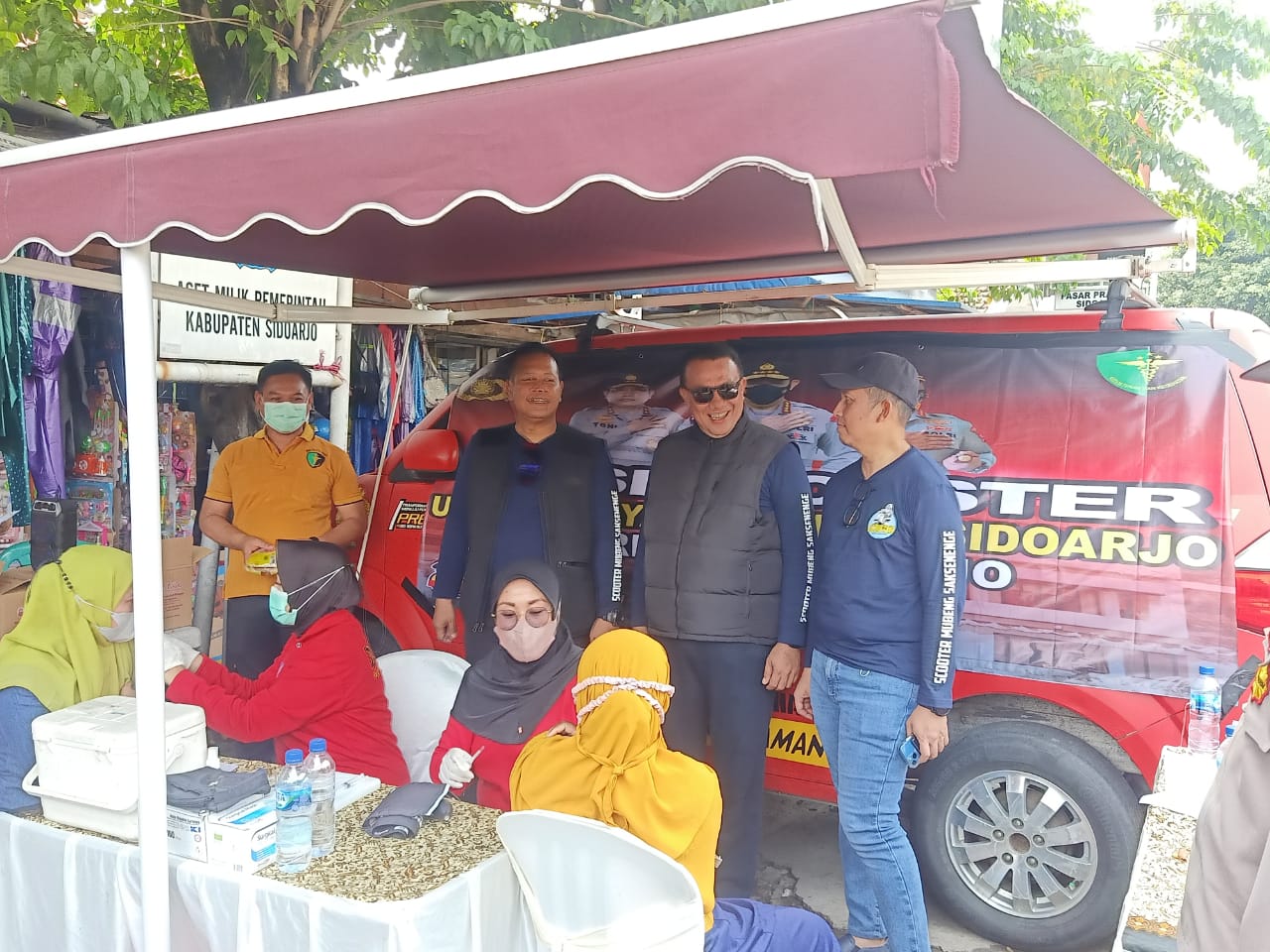 Kapolresta Sidoarjo Kombes Pol Kusumo Wahyu Bintoro SH SIK didampingi Dir Satresnarkoba Polda Jatim Kombes Pol Arie Ardian Risadi , Dir PAM Obvit Polda Jatim Kombes Pol Bonaparte Silalahi menunggangi Scooter Vespa Piaggio sepedaan mubeng mubeng sak senenge dan berbagi Bansos Sembako ke warga masyarakat pasar prambon jalan raya Desa Prambon, berkenaan dengan giat tersebut, Dokkes Polresta Sidoarjo menggebyar vaksinasi dosis 1-2-3 , dosis yang disiapkan kurang lebih 150 dosis, hari Sabtu tanggal 3/12/22.